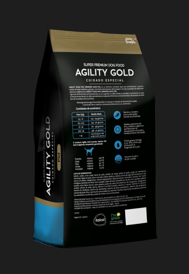 Agility Gold Piel es un producto diseñado para nutrir la piel y pelaje de perros adultos, con ingredientes específicos para este fin, contiene proteínas de Salmón y Cordero altamente digestibles que apoyan la formación ideal del pelo (resistente y brillante). Contamos con ácidos grasos esenciales Omegas 3, 6 y Dha, que promueven una piel hidratada y elástica la cual favorece la salud integral de la misma, con antioxidantes naturales y minerales orgánicos los cuales apoyan el fortalecimiento del sistema inmunológico, así como con la adición de las Vitaminas del complejo B que favorecen la queratinización adecuada del pelaje de nuestras mascotas.