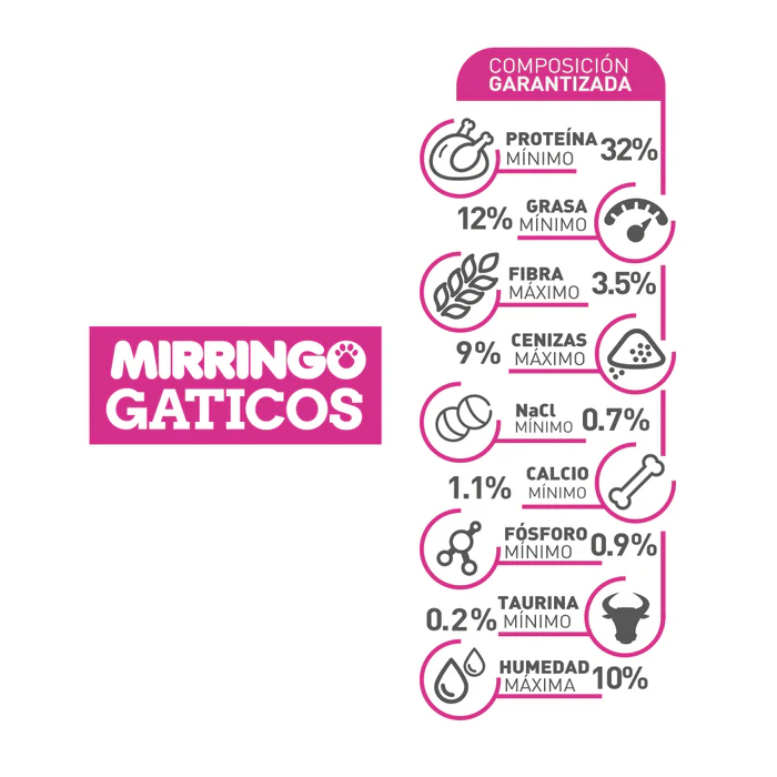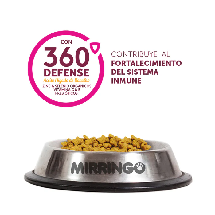 Mirringo Gaticos 360 Defense con aceite de hígado de bacalao es un alimento completo y balanceado, diseñado para satisfacer todos los requerimientos nutricionales, contribuyendo a un sano crecimiento y fortalecimiento del sistema inmune.
