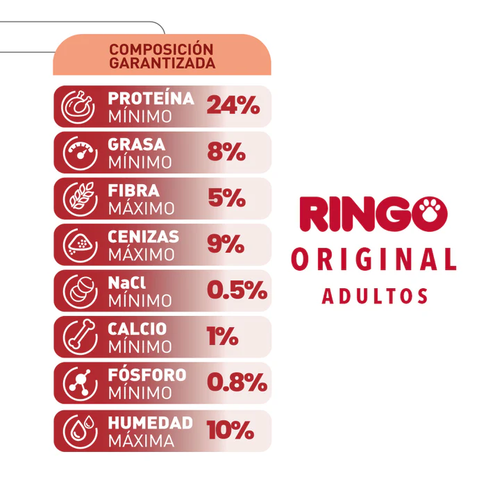 Ringo Original Adultos es un alimento completo y balanceado, con excelente calidad y un delicioso sabor que les encanta, aportando energía para el desarrollo de las actividades del día a día de tu mascota. Además, con vitaminas y mineras que ayudan a un pelo sano y fuerte.